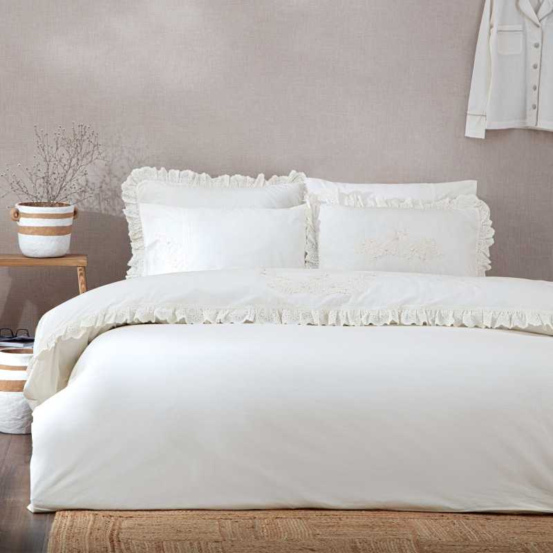 ست روتختی «اِلسا» یکی از ظریفترین و کلاسیکترین طراحیهای اکوکتان است؛ محصولی که با ترکیب چیندوزی رافل (Ruffle) و لبهدوزی ایلتدار (Eyelet Lace) ظاهری کاملاً کارگاهی، رمانتیک و چشمنواز ایجاد میکند.